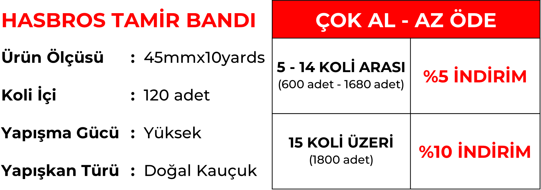 HASBROS Çok Amaçlı Tamir Bandı; evde, iş yerinde ve dış mekanlarda acil onarımlar için mükemmel çözümdür. Güçlü yapışkan yapısı, su geçirmezliği ve yüksek dayanıklılığı sayesinde yırtık, çatlak ve deliklerin hızlıca kapatılmasını sağlar. Her zaman elinizin altında bulunması gereken pratik bir üründür.