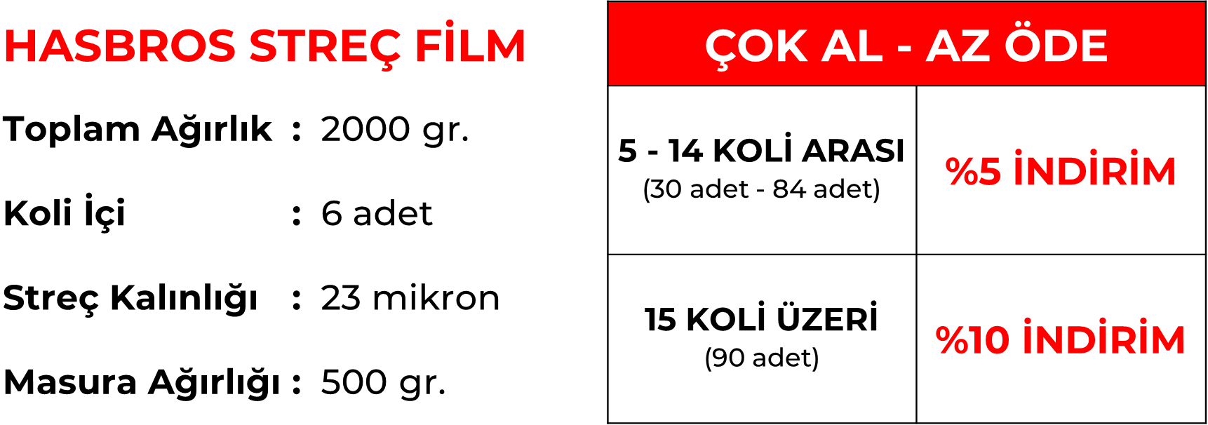 HASBROS Streç Film manuel kullanım için geliştirilmiştir. Güçlü sarım kabiliyeti ve delinmeye karşı dayanıklılığıyla öne çıkar. Ürünlerinizi taşıma ve depolama sırasında toz, nem ve dağılmaya karşı korur. Gıda, tekstil, beyaz eşya ve inşaat sektörlerinde güvenle tercih edilir.